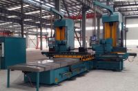 ? ? ? ? 數(shù)控五軸雙立柱鏜床為臥式雙面布置,主要適合加工對稱度要求高的孔的鏜削加工。并能附帶高速銑削、?低速銑削、鉆孔等功能。工件放在專用移動工作臺上,左右分別兩個立柱帶可橫向移動的滑臺,滑臺上放動力頭。移動工作臺、橫進滑臺及立柱滑臺由數(shù)控系統(tǒng)控制,主軸轉速通過變頻器調速。該機床由一套五軸數(shù)控系統(tǒng)控制,配備兩套懸掛式控制箱,并配可持式手脈。機床配有獨立的液壓站,能夠實現(xiàn)立柱滑臺的自動鎖緊。運動部分采用滾珠絲杠連接。機床配有獨立的電器柜,并有風冷裝置。